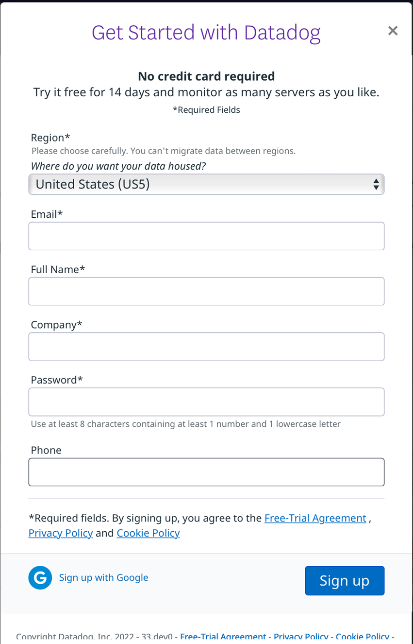 You need a Datadog account that allows you to post log data. You can start free by accessing https://www.datadoghq.com and click on “GET STARTED FREE”