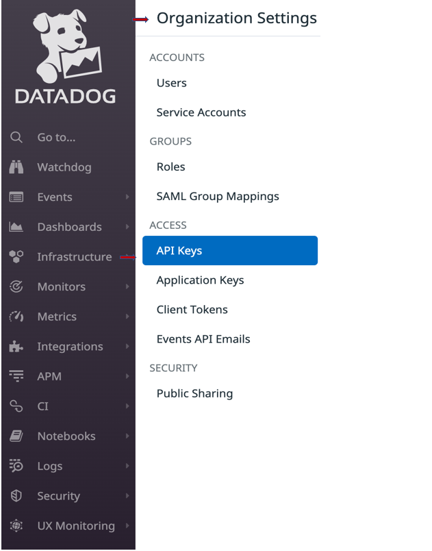 If you have an existing Datadog account, the API keys can be seen or generated by accessing Organization Settings in DataDog web console