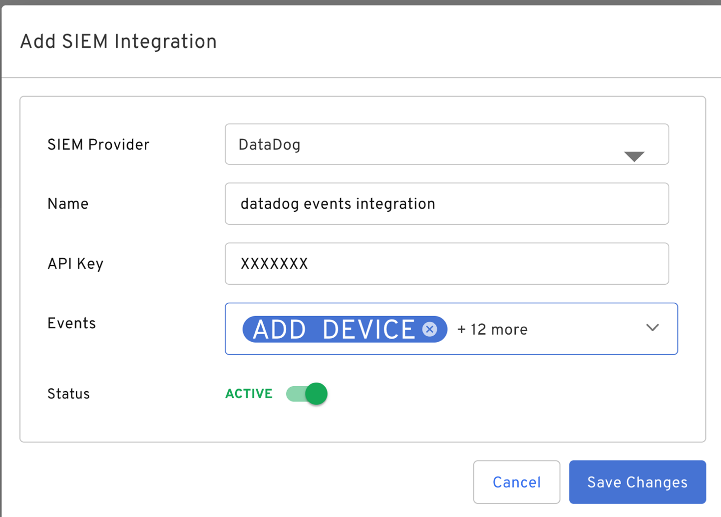 The configuration is done using the BI admin console. Access BI admin console through your SSO integration. Click on “Integrations” and click on “SIEM”. Under “SIEM Configurations”, click on “Add SIEM integration”. In “SIEM Provider” drop down, choose DataDog