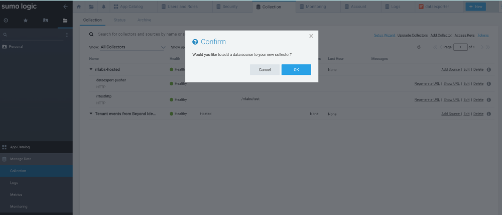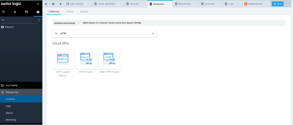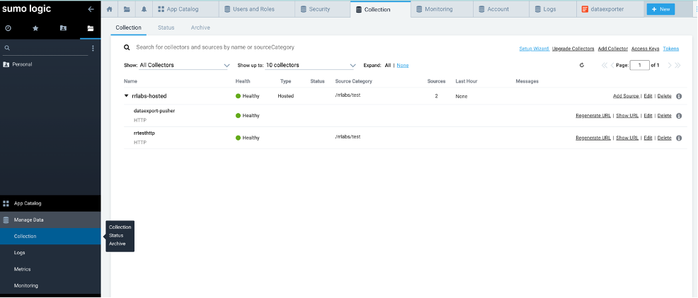 Access your Sumologic tenant URL and login as a user with administrative privileges. In the dashboard, click “Collections” under “Manage Data”