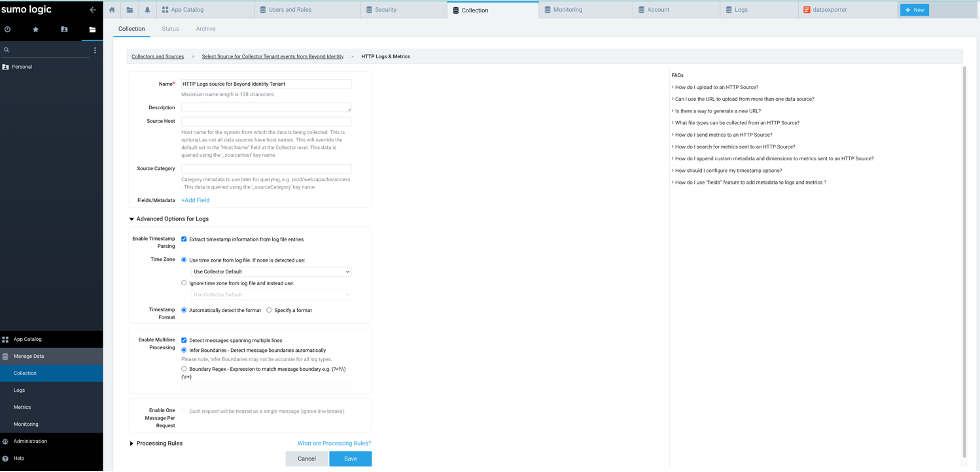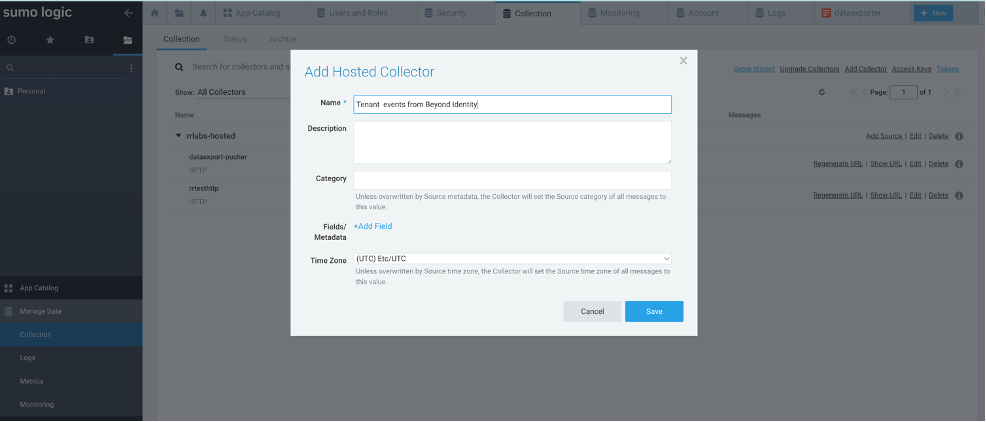 Type in a name for the Hosted collector, for example “Tenant events from Beyond Identity” and add a relevant description. Leave other fields to the default values. Click “Save”