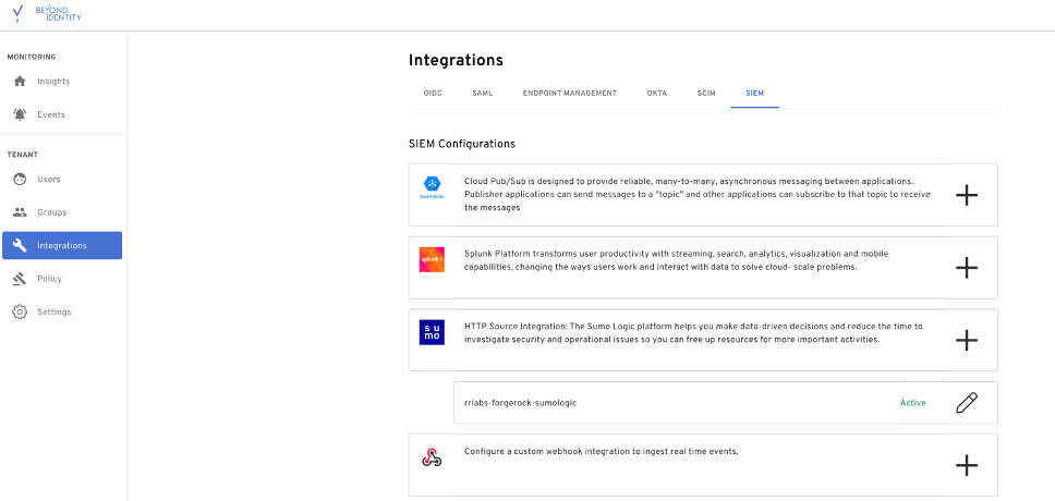 The configuration is done using the BI admin console. Access BI admin console through your SSO integration. Click on “Integrations” and click on “SIEM”