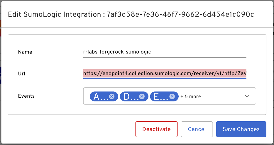 Click on the “+” sign next to Sumo. Using HTTP source address copied in section 3.2 fill out the value for Url. Provide a name for the configuration. From the events drop down, “select all” events or one the events you are interested in.