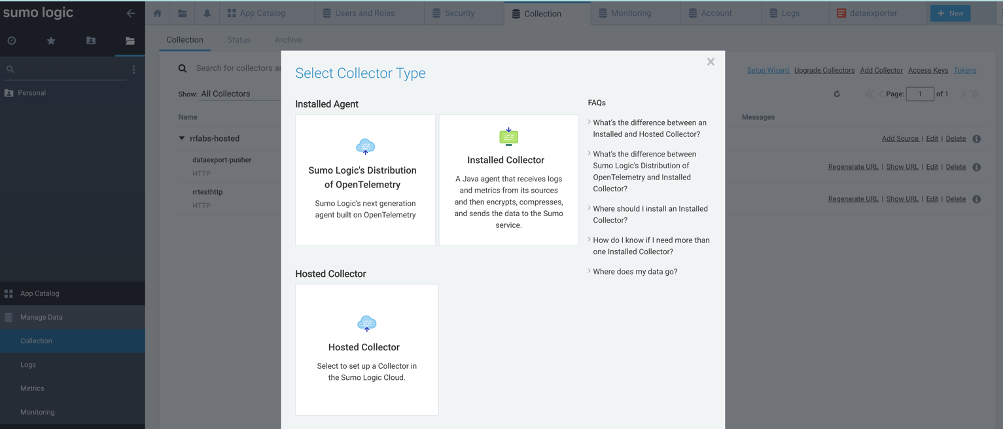 On the right-hand side top menu, click “Add Collector”. In the “Select Collector Type” screen, click on “Hosted Collector”