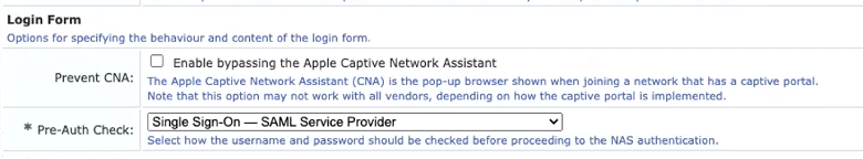 - Under Login Form🡪Pre-Auth Check: Pick SAML Service Provider