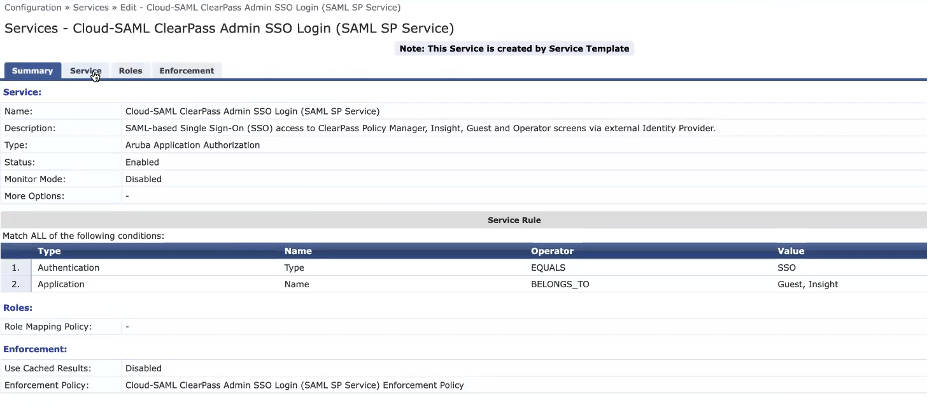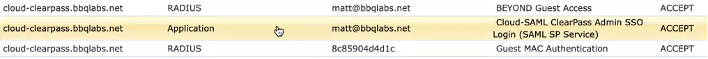 - At this point the SAML SP service is invoked in CPPM (ex: Cloud SAML Clearpass Admin SSO Login service with enforcement profile to instruct the device to perform full RADIUS auth)