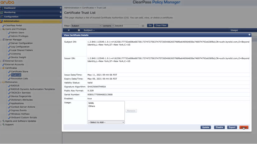- Browse the Beyond Identity Certificate downloaded in the step 6 in the previous configuration and update the Usage as SAML and Others as shown below