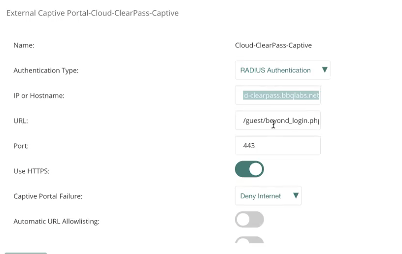 - Primary server: Aruba CPPM FQDN