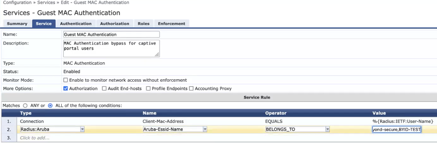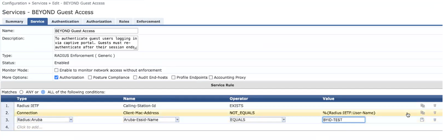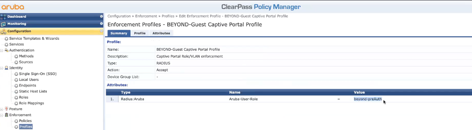 - Aruba CPPM invokes the Guest Mac Authentication service which has an enforcement profile (ex: Beyond-Guest Captive Portal Profile) that is configured to return a role name which matches the one configured in the IAP. (ex: beyond-preAuth)