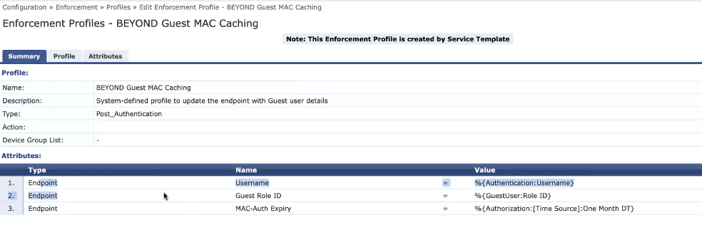 - At this point the CPPM invokes a BEYOND Guest Access service (created earlier) for post auth which refers to an enforcement profile created to set the Mac address caching to a day or a month.