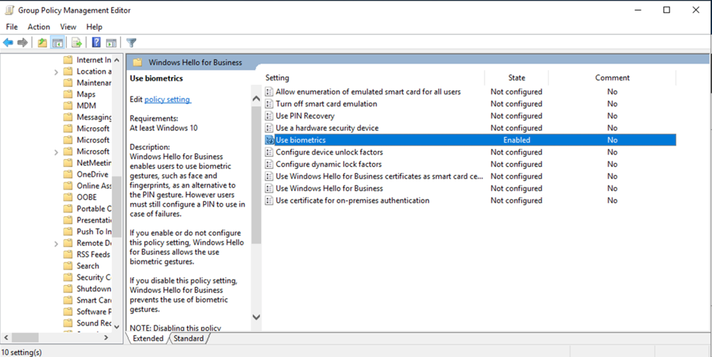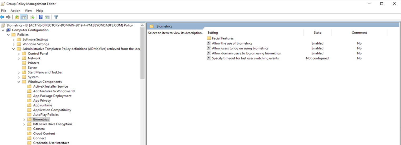 Navigate to Computer Configuration > Policies > Administrative Templates > Windows Component > Biometrics section, and enable the following policies: