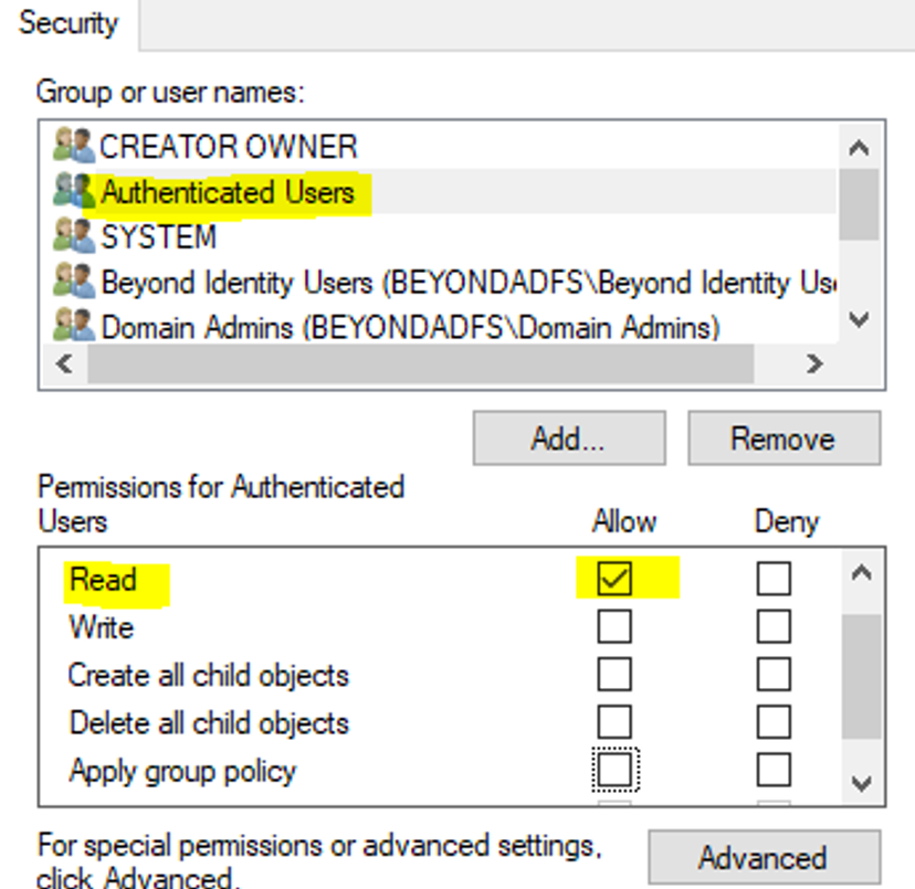 - Click on “Beyond Identity Users” group and click on “Allow” permissions for “Read”, “Create all child objects”, “Delete all child objects” “Apply group policy” and click “Apply”.