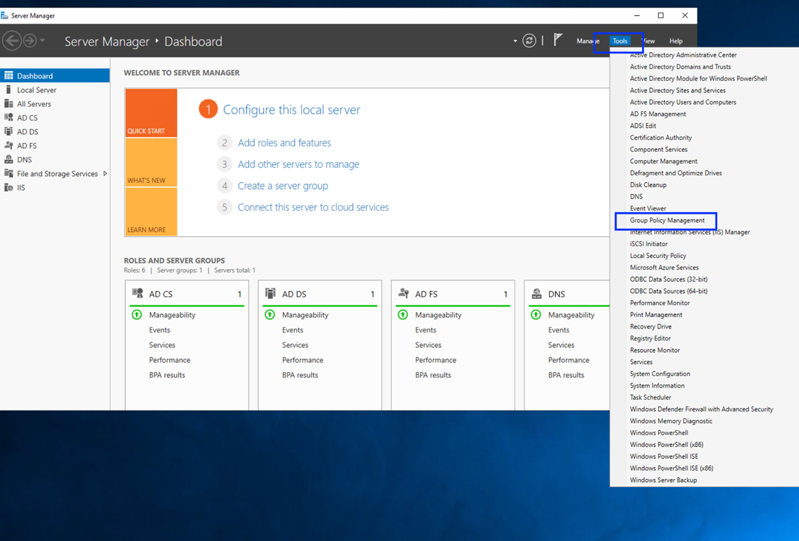 - Click on “Tools” and then on the pull-down menu, click on “Group Policy Management”.