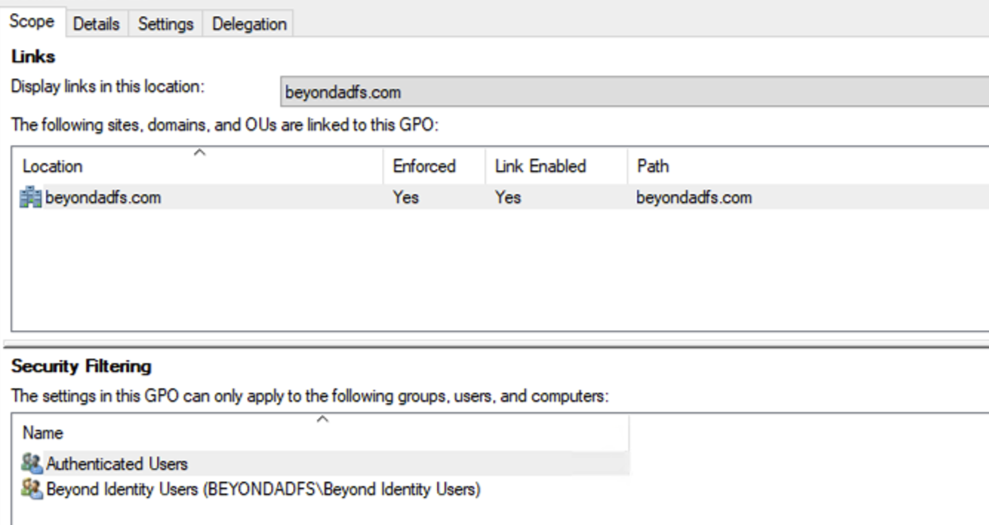 - Under Security Filtering, Add the “Beyond Identity Users” group.