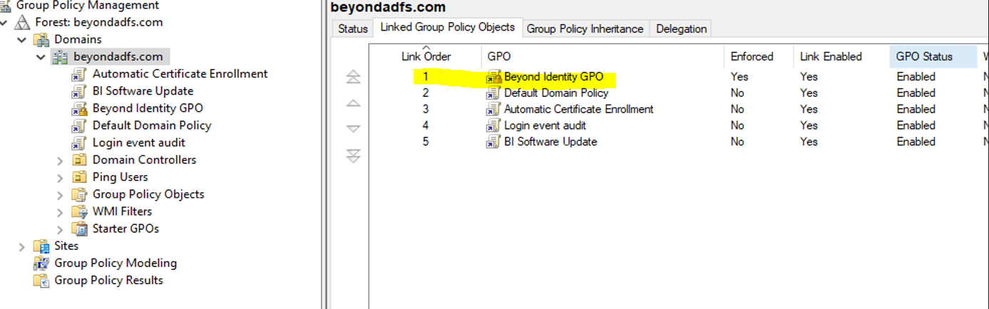 - Make sure the newly created “Beyond Identity GPO” has the link order 1.