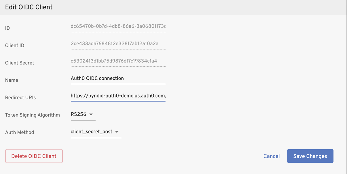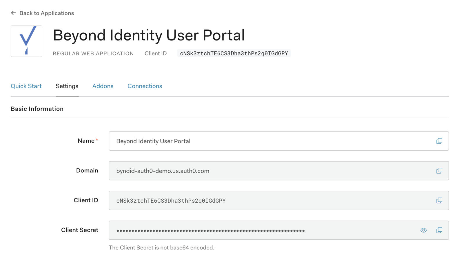 - Provide “Client ID” and “Client Secret” assigned to Admin Application in Auth0 (as per Step 1) to Beyond Identity SE. Beyond Identity team will collect and configure those values at the backend.