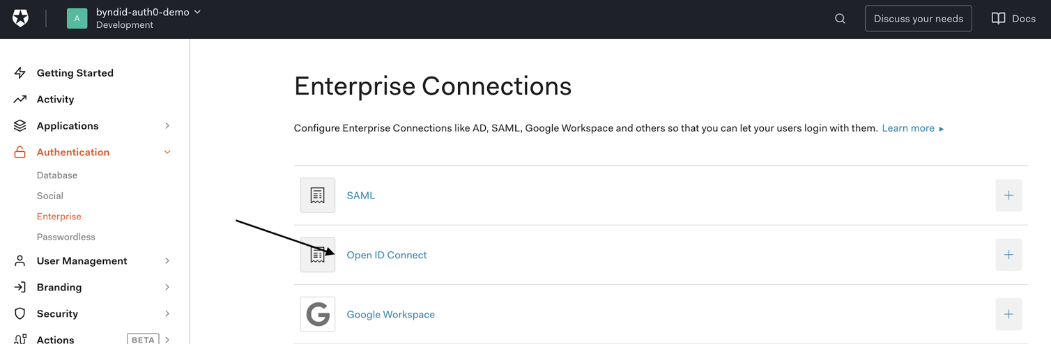 - On the Enterprise Connections page - Click ‘Open ID Connect’