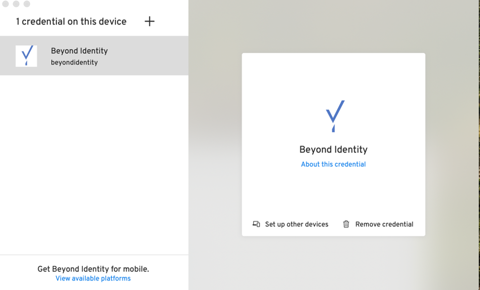 - By clicking on Step 2 “Register New Credential”, the user’s credential will get enrolled in the Beyond Identity service on the back end. On the front end, users who click Step 2 will be taken to the Beyond Identity Authenticator where they will see the progress of their credential registration. Once completed, the user will see a credentials in the Authenticator.