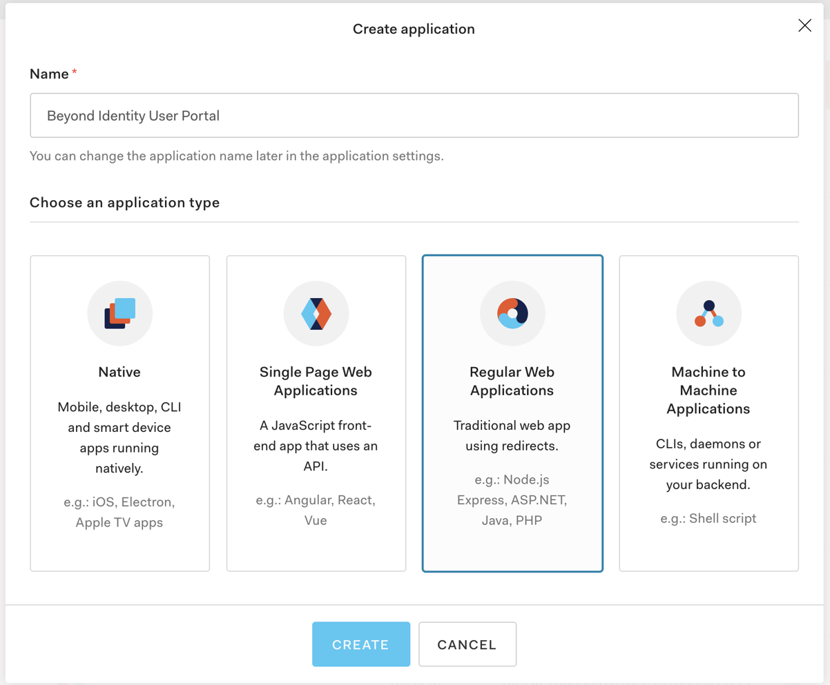 - Call the application “Beyond Identity Admin Portal”, Choose “Regular Web Application” and click ‘Save’