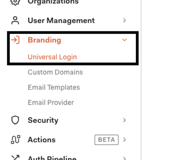 - In the Auth0 Management Dashboard, on the left hand-navigation window click ‘Branding’ and then ‘Universal Login’ on the expanded sub-menu.