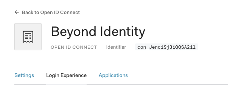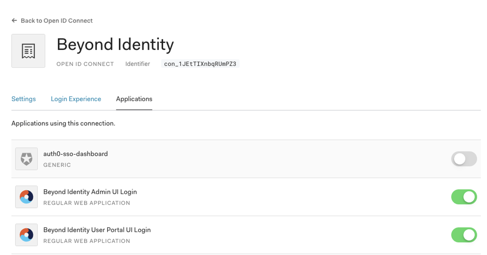 - Lastly, on the Applications tab within the OIDC connection - enable this connection for the Beyond Identity Admin and User portal applications which were created in Step 1 and 3.