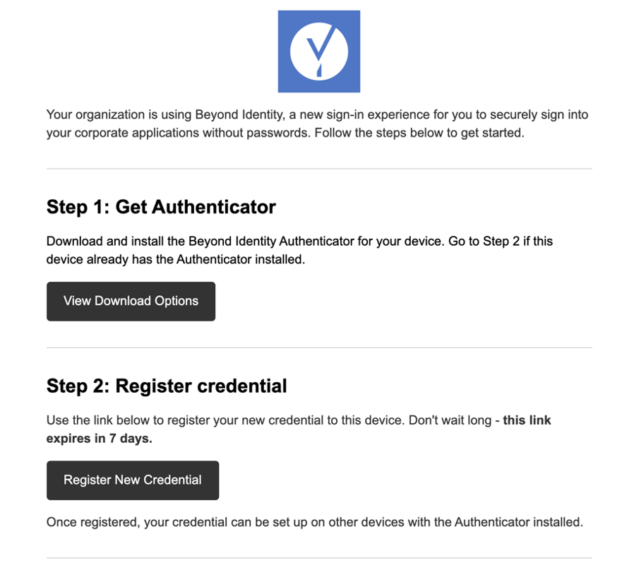- Enrolled (provisioned) user will receive an email from Beyond Identity welcoming them to the new Identity Provider.