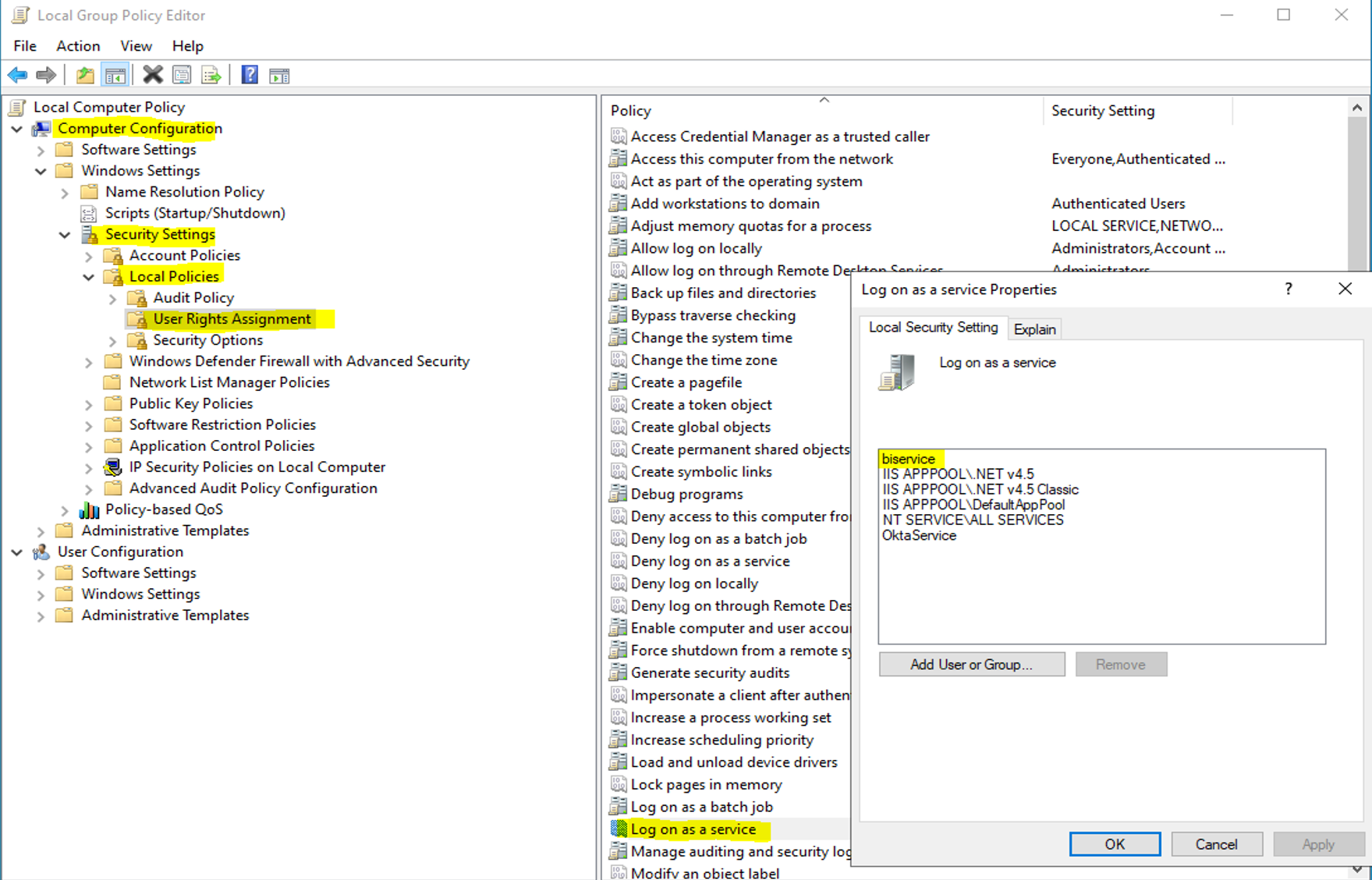- Navigate to Computer Configuration > Windows Settings > Security Settings > Local Policies > User Rights Assignment.