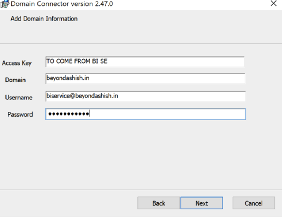 Company domain (e.g.beyondadfs.com) - Username: service account name used to run the Beyond Identity Service (e. g. biservice@beyondadfs.com)