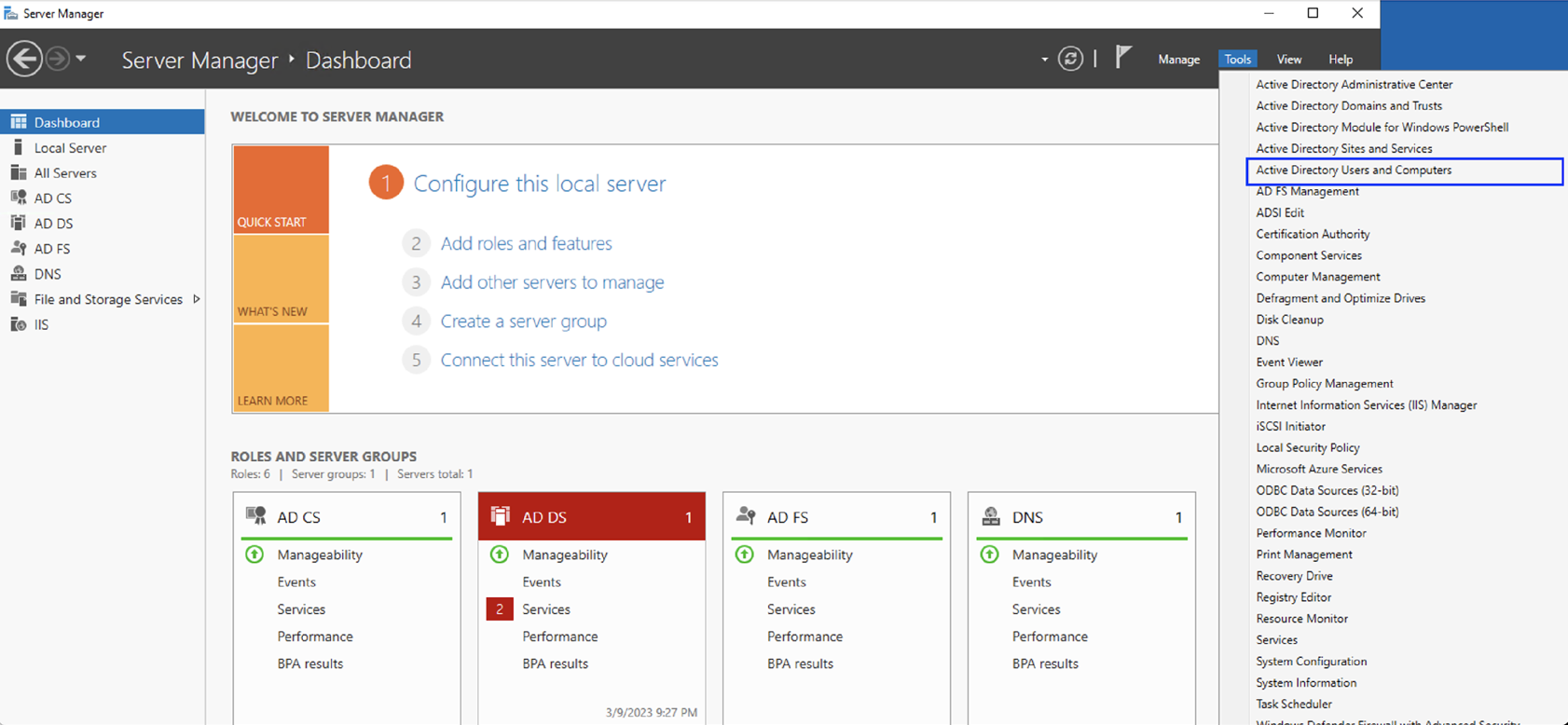 - Click Tools and then on the pull-down menu, click Active Directory Users and Computers.