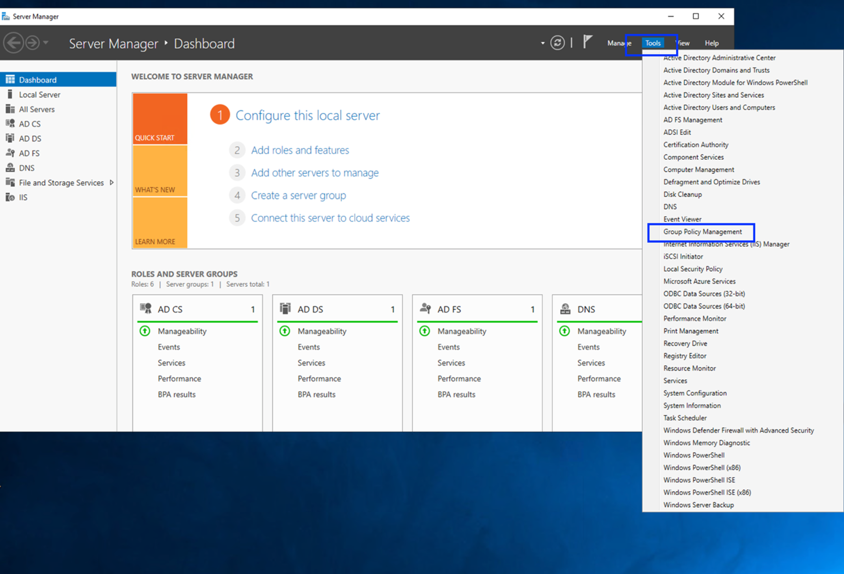 - Click Tools and then on the pull-down menu, click Group Policy Management.