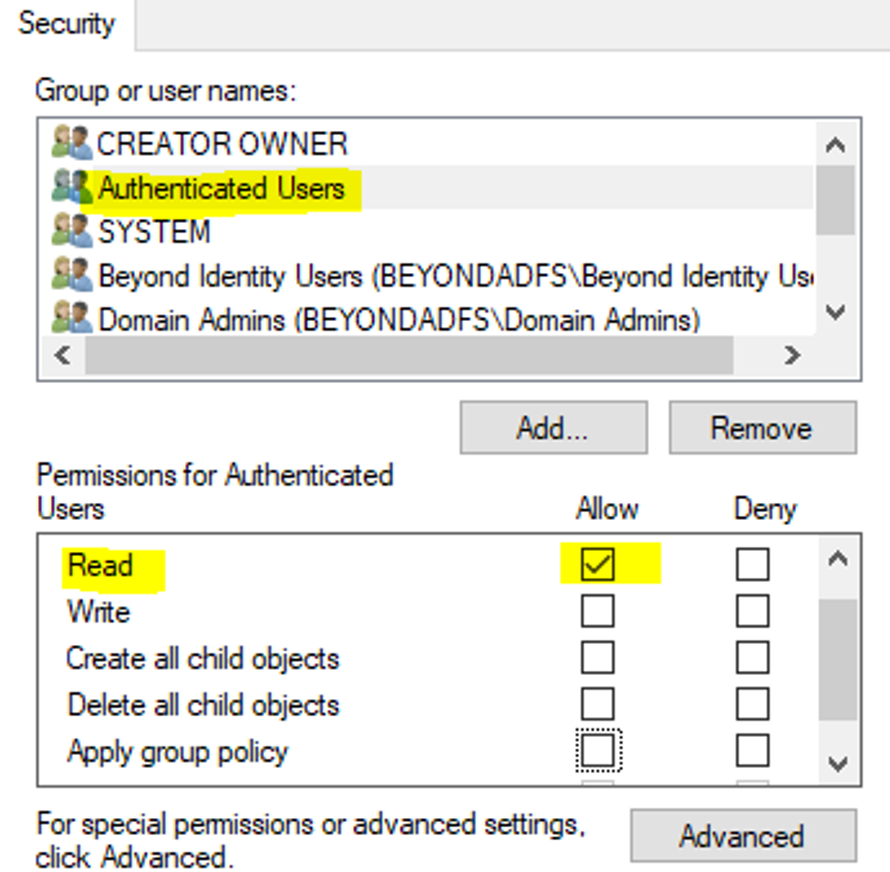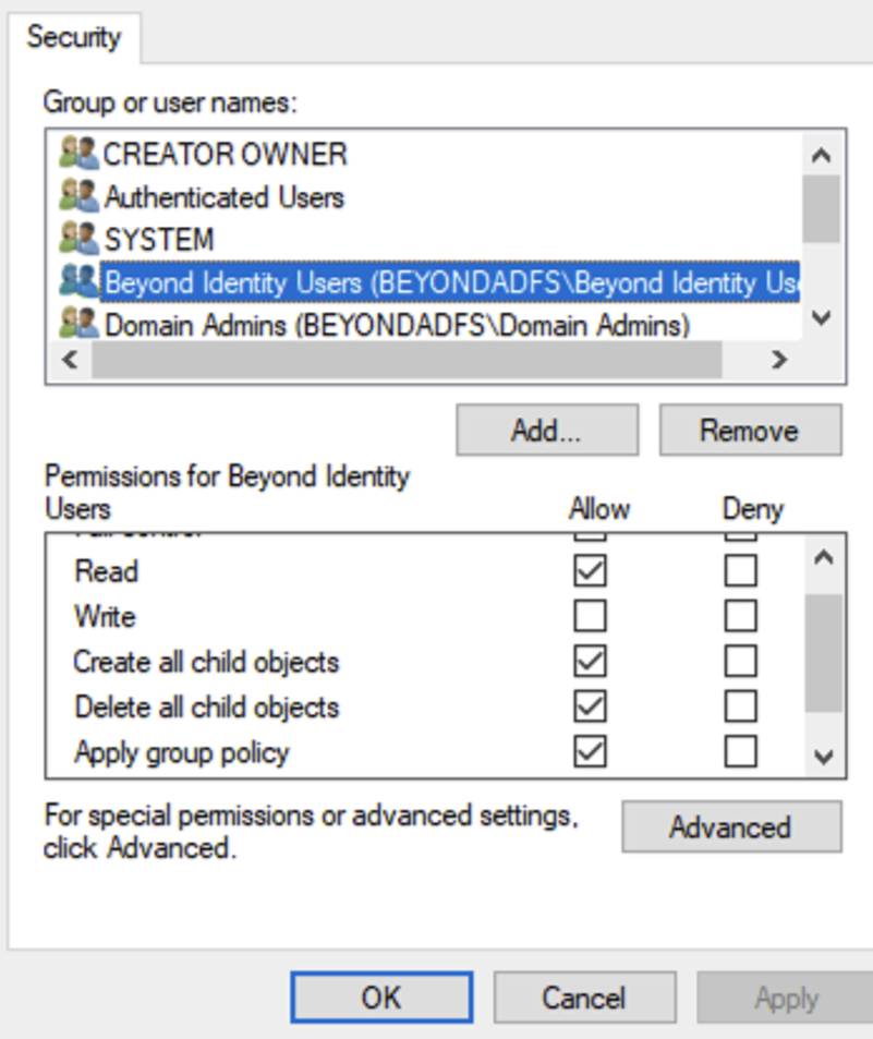 - Click the Beyond Identity Users group and click on Allow permissions for Read, Create all child objects, Delete all child objects, and Apply group policy. Click Apply.
