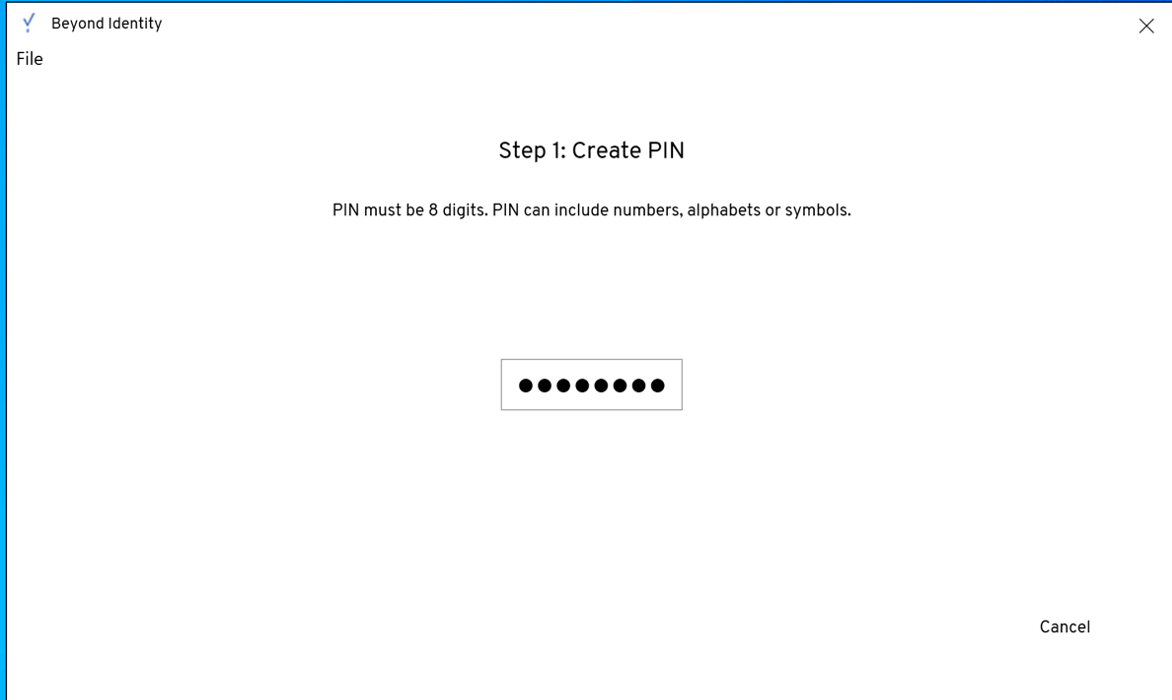 - Create a PIN that will be used for passwordless login. Minimum length is 8 characters. Press ENTER once you have entered the PIN.