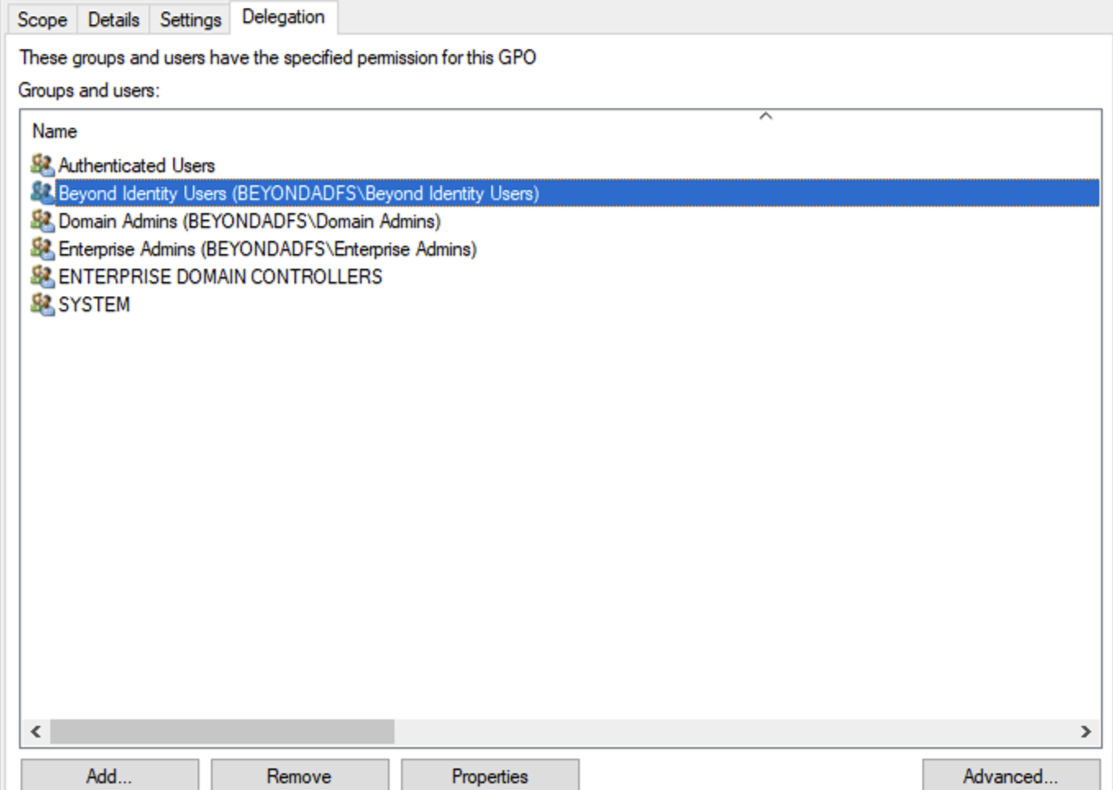 - Under Security Filtering, add the Beyond Identity Users group.