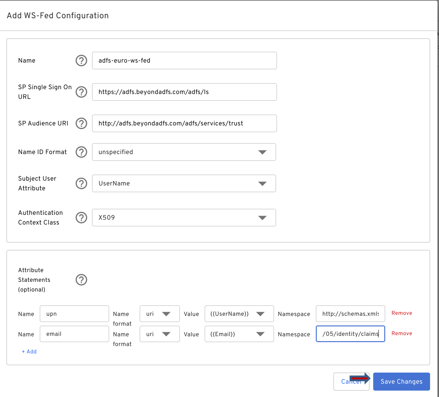Under “Attribute Statements (optional)”, add upn and email attributes as shown below. For “Namespace” type in http://schemas.xmlsoap.org/ws/2005/05/identity/claims