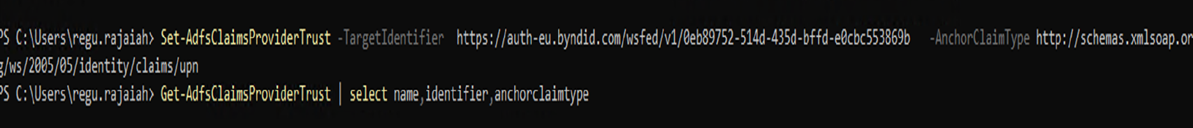- Set-AdfsClaimsProviderTrust -TargetIdentifier https://auth-eu.byndid.com/wsfed/v1/0eb89752-514d-435d-bffd-e0cbc553869b -AnchorClaimType http://schemas.xmlsoap.org/ws/2005/05/identity/claims/upn
