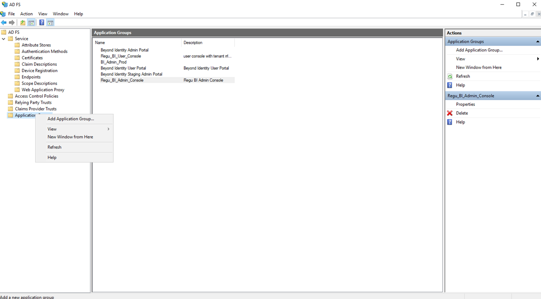 - From the ADFS management console, right-click on “Application Groups” and choose “Add Application Group.”
