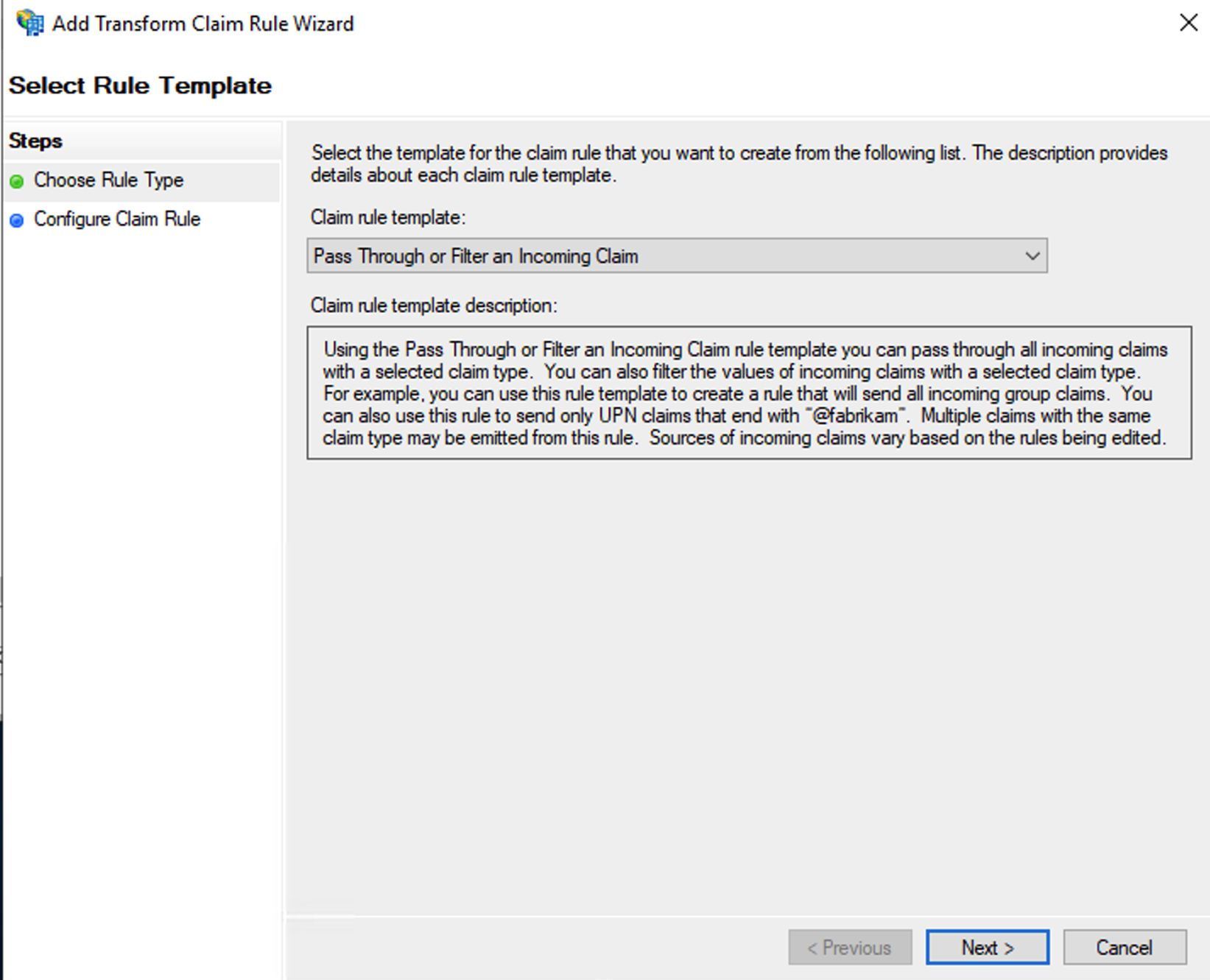 - Select “Pass Through or Filter an Incoming Claim” under claim rule template drop down and click next. Note: this step may be different for each customer.