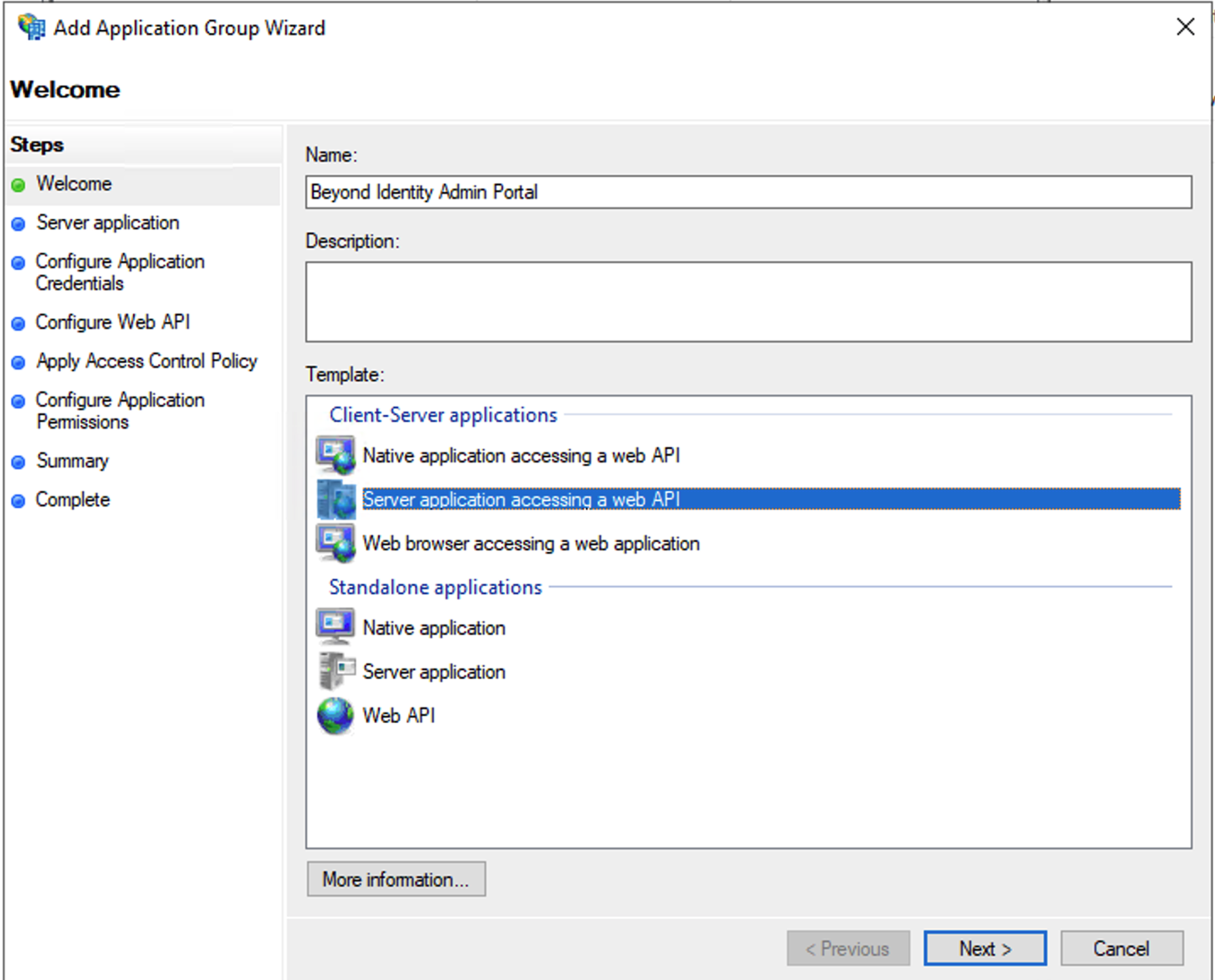 - Select “Server Application accessing a Web API”, provide a Name (Beyond Identity Admin Portal), and click “Next”