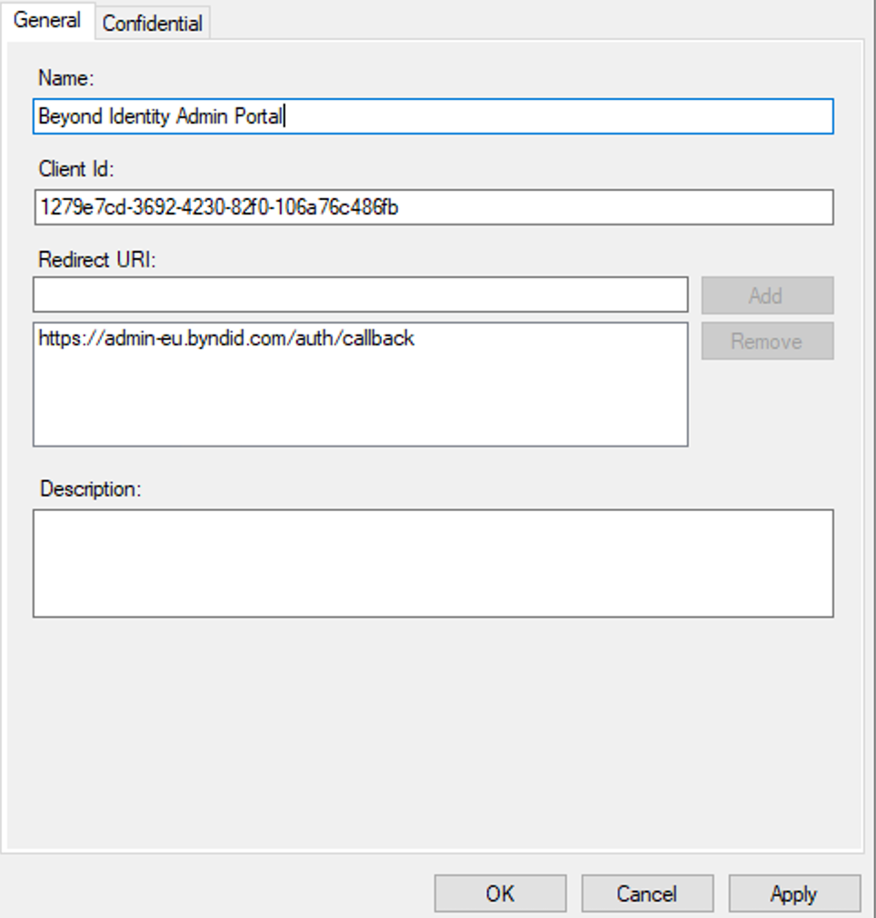 - Provide a Redirect URI and click “Add”. Also, copy the Client Identifier, this is the OIDC Client ID that is used to configure the Beyond Identity admin portal.