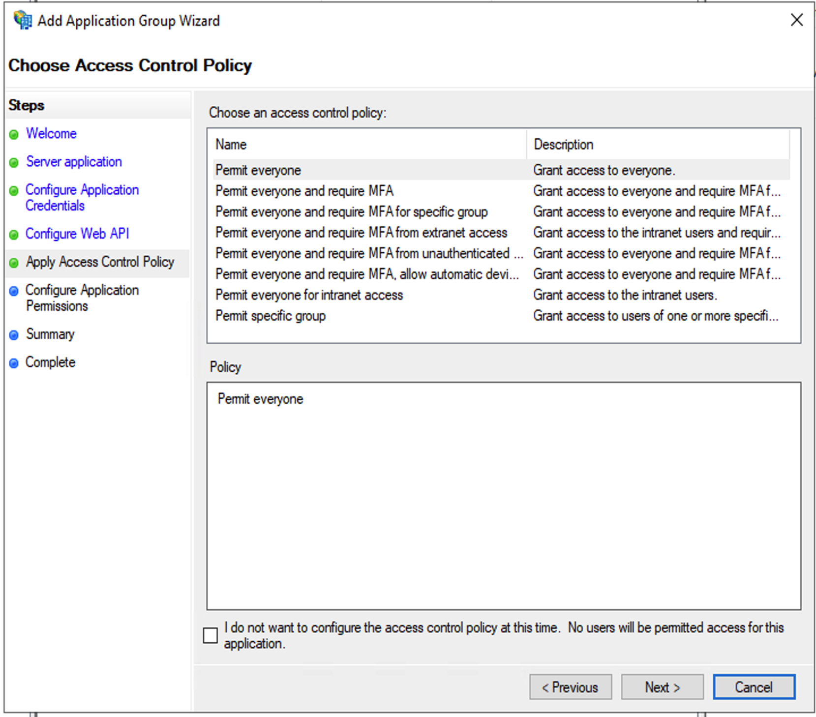 - In the “Choose Access control Policy” screen, select “Permit everyone”. Click Next.