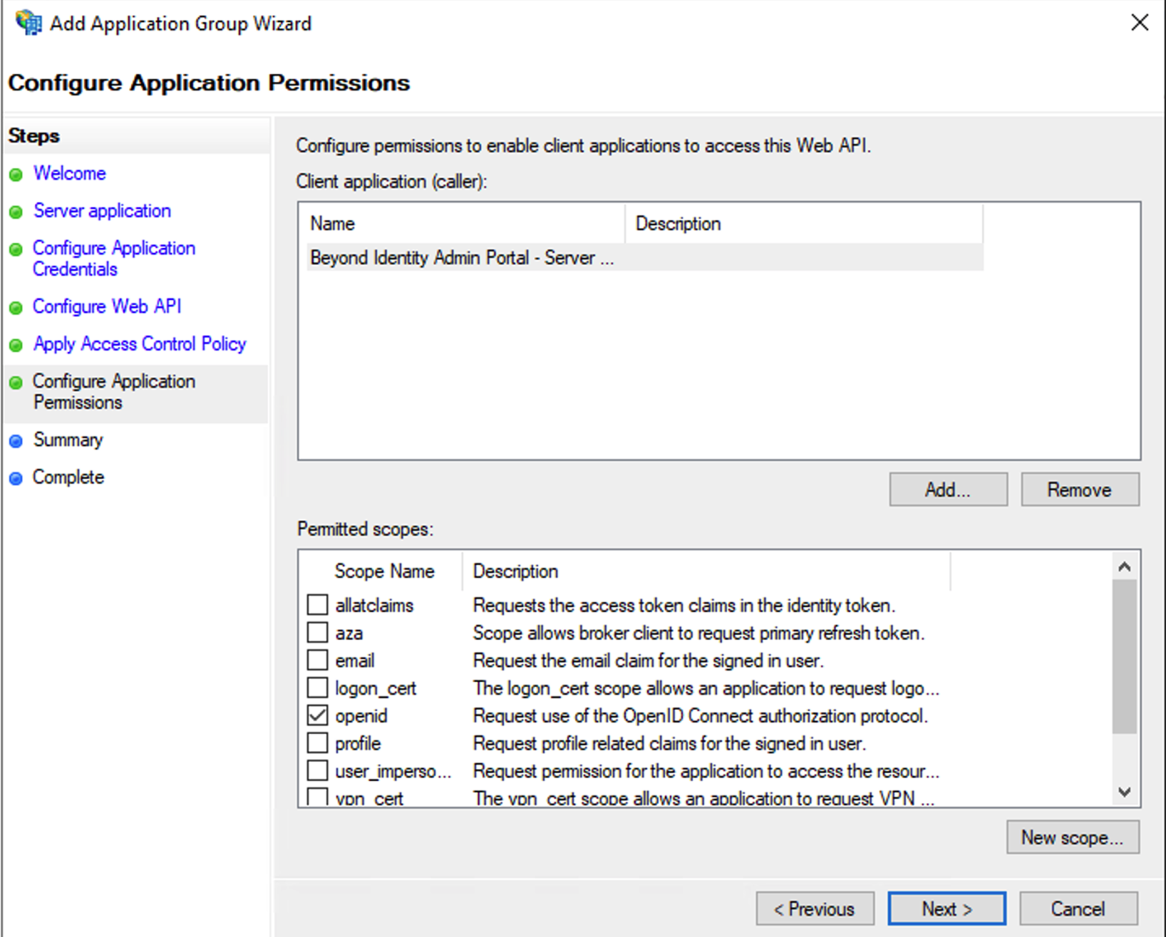 - In “Configure Application Permissions”, under “Permitted scopes” select “openid”. Click Next.