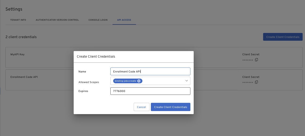 - Create and manage Beyond Identity API client credentials, tokens, and scopes in the Admin Console Settings > API Access. You can now leverage the Beyond Identity Console to create API tokens with the binding-jobs:create scope. These tokens can be used to authorize creation of enrollment codes (short codes) via the BindingJobs API https://docs.beyondidentity.com/api/v0#tag/BindingJobs.
