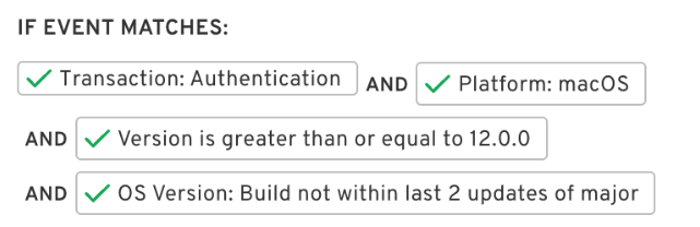 In this example, we have set up a policy rule using the OS version check condition containing "Within the Last N Versions" of a major release: