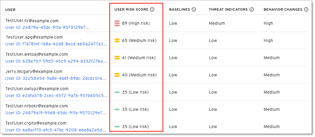 This means that the risk scores are outlier scores. Users with a risk score of zero are more secure than average, while users with medium or high-risk scores have anomalously high detection rates.