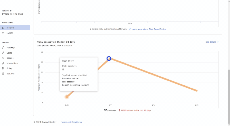 - Hover over a point in the Risky passkeys in the last 30 days graph.
