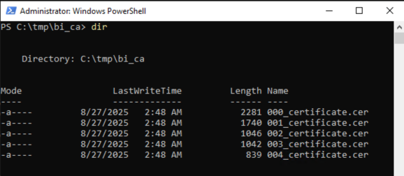 The certificates listed are the root certificate and four intermediate issuers, comprising the current Beyond Identity CA. These must be trusted on your Active Directory installation, which the next section will describe how to do.000_certificate.cer