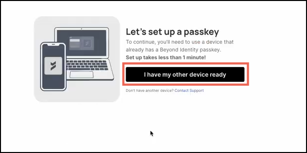 Select I have my other device ready to continue. This tells the system you’ll use an existing passkey from a secondary device to establish trust.