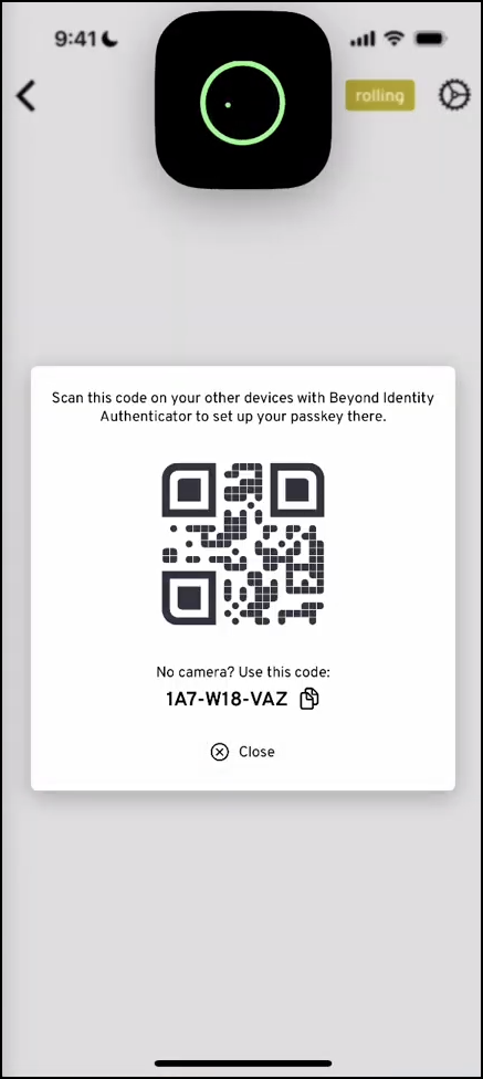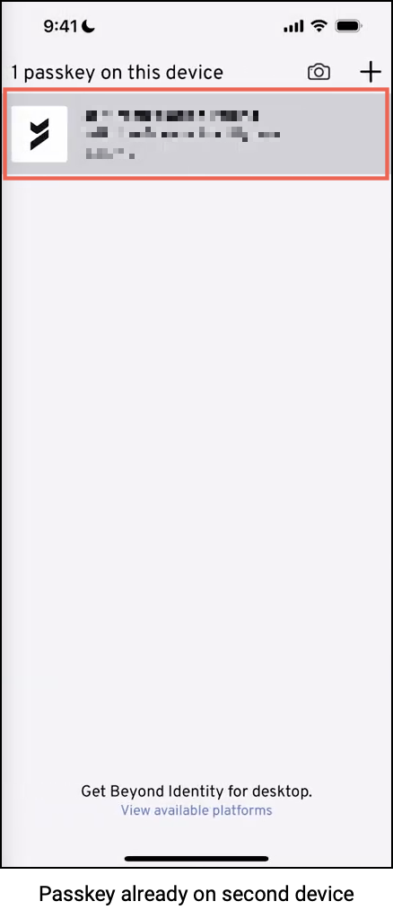 On your secondary device (e.g., iPhone or Android, laptop), open the Beyond Identity Authenticator. You’ll see your passkey listed under 1 passkey on this device.