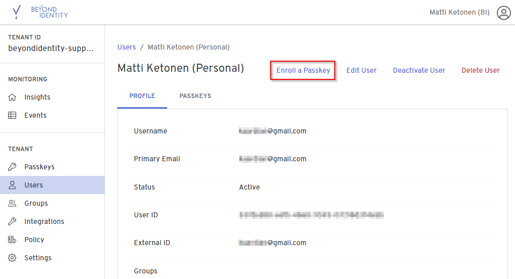 To re-enroll user, or otherwise reset their passkey and get a new enrollment email sent to the user follow the steps: