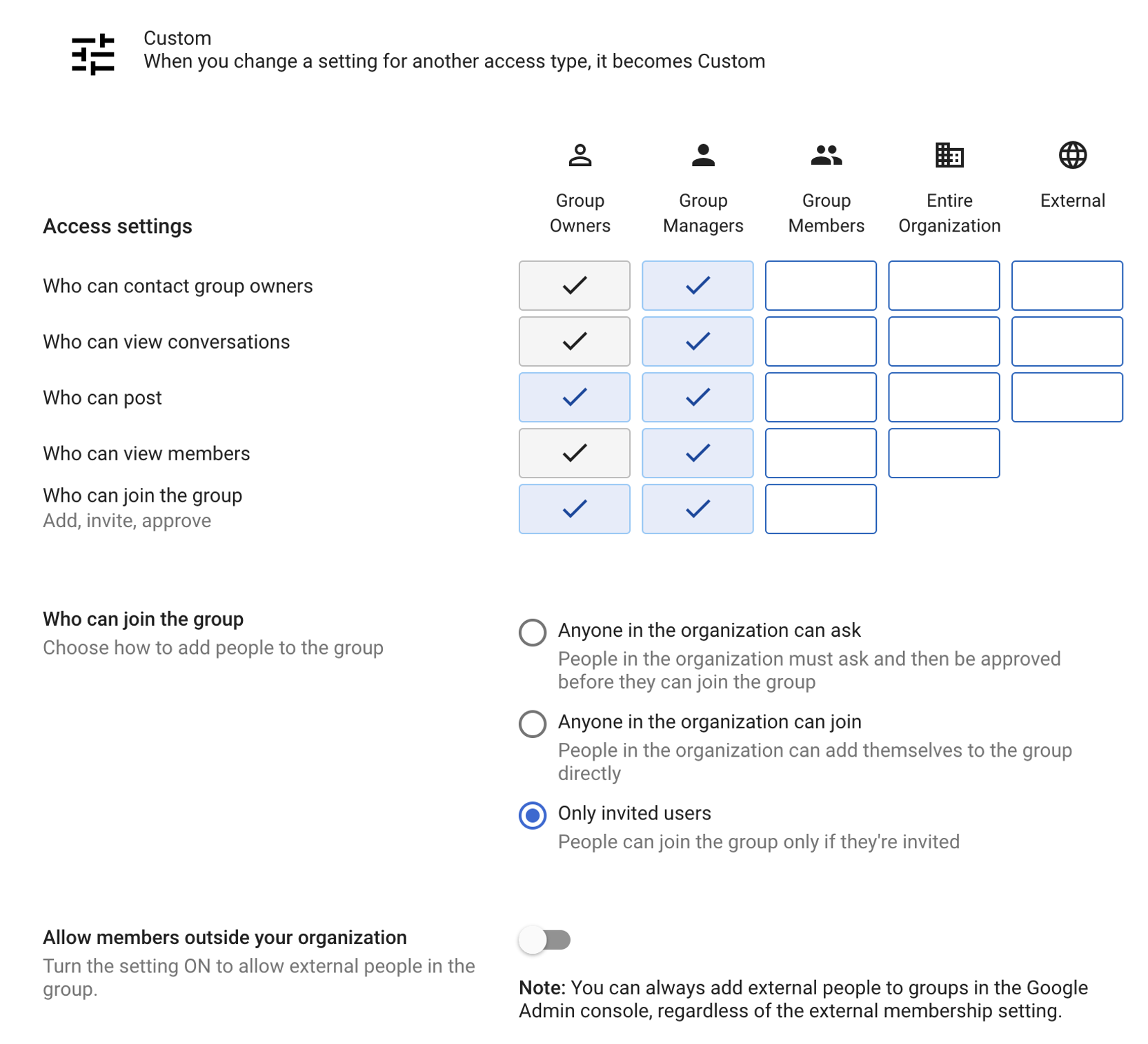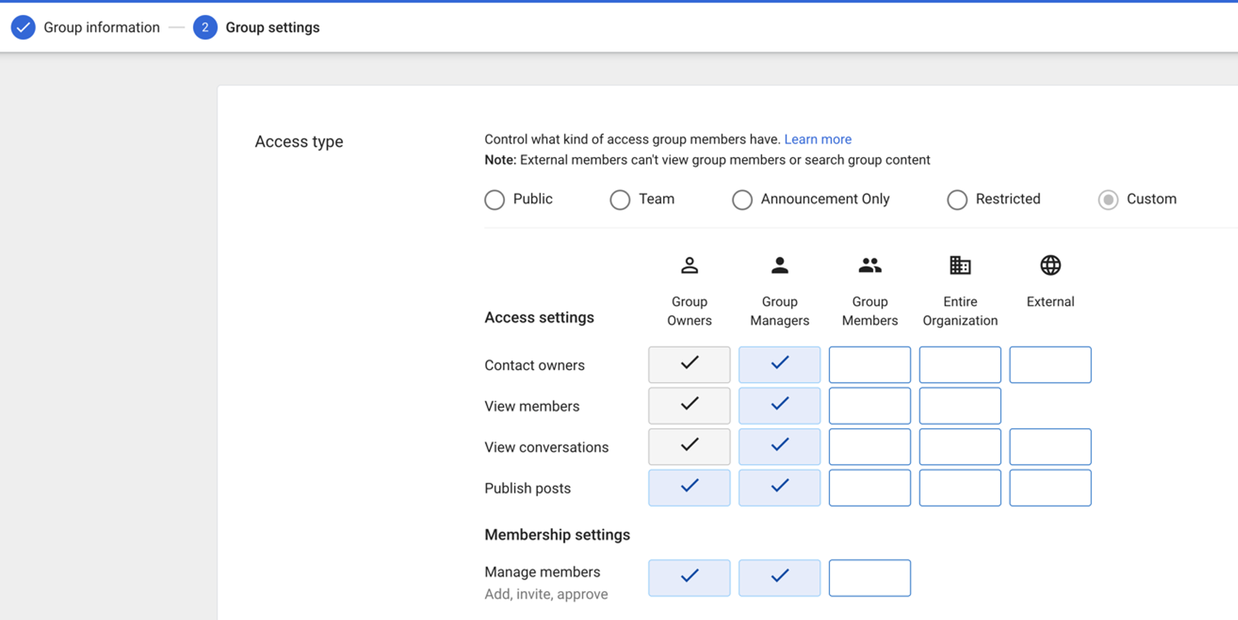- Only “Group Owners” & “Group Manager” should have permissions for Access Settings and Membership settings.